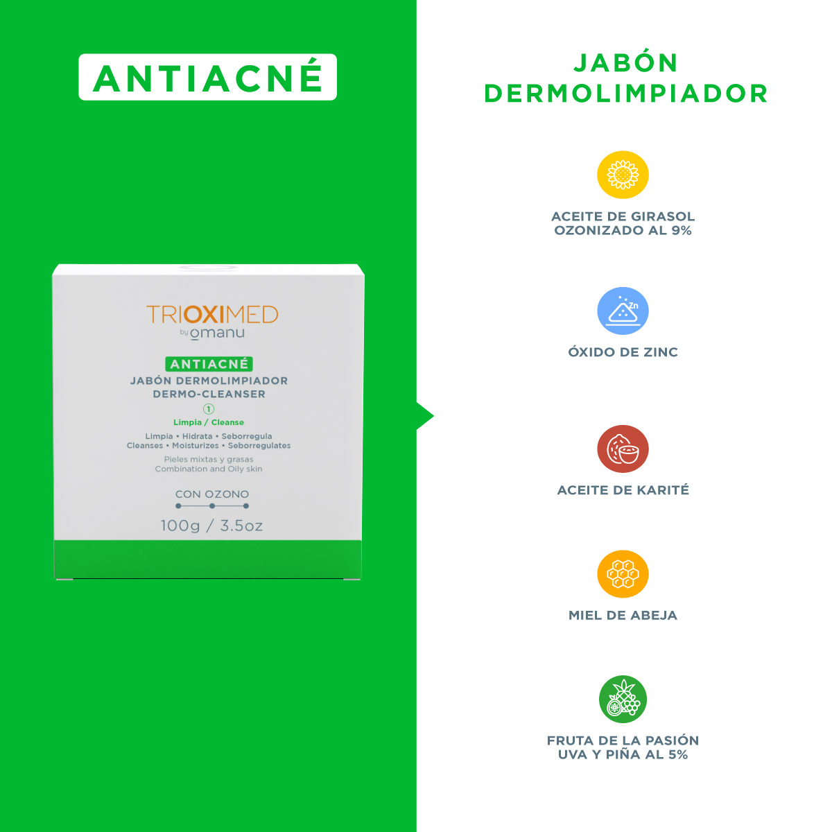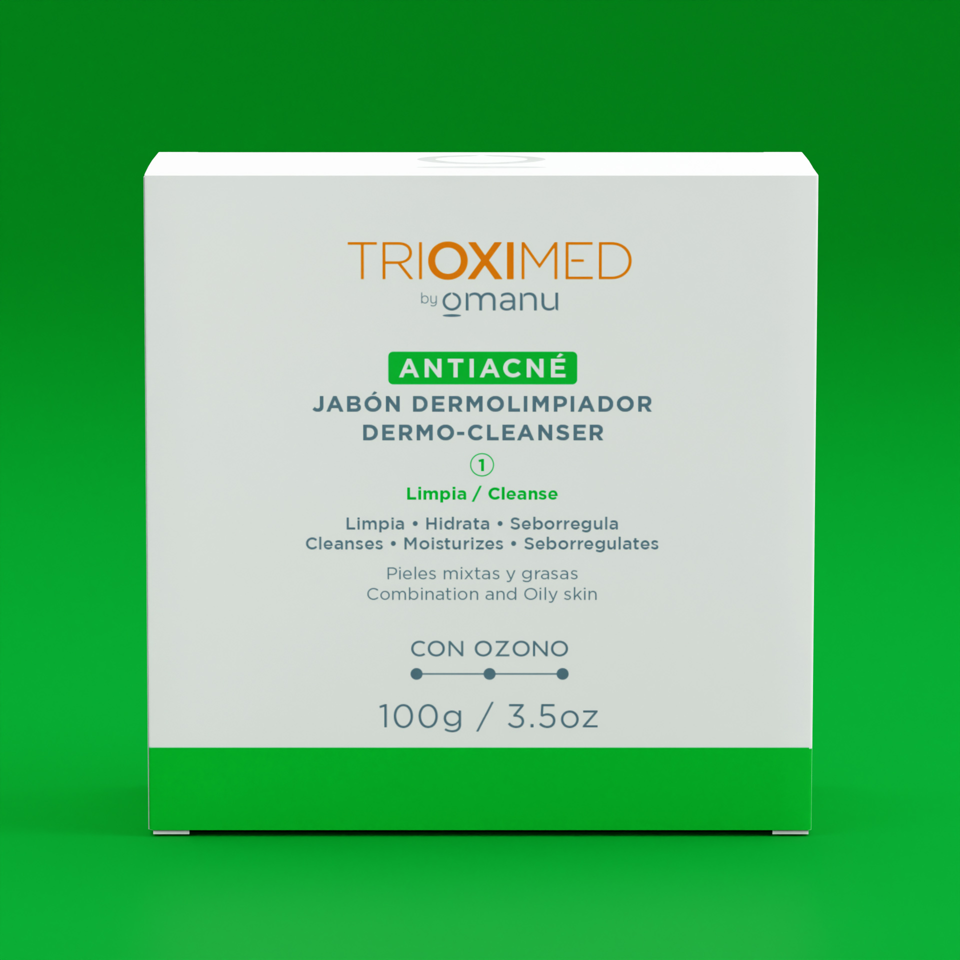 Trioximed jabón dermolimpiador antiacné favorece la restauración dérmica con su efecto microbicida y antiinflamatorio. Es comedolítico y seborregulador además de hidratar y suaviza la piel debido a su efecto exfoliante. Recomendado para pieles mixtas a grasas y con tendencia acneica.